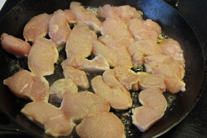 4. Skär under tiden kycklingfilén i ca 1 cm tjocka skivor. Smält en klick smör i en stekpanna och lägg i skivorna och stek tills de fått lite färg. Krydda med salt och vitpeppar.