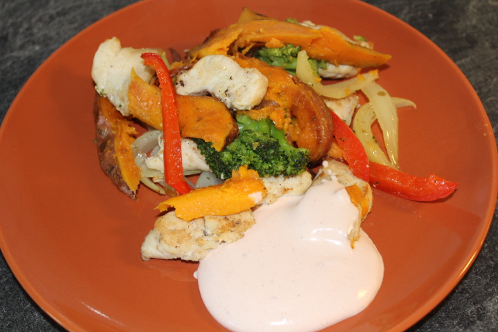 Kycklingfilé med ugnsrostade grönsaker och kall sås 4 port
