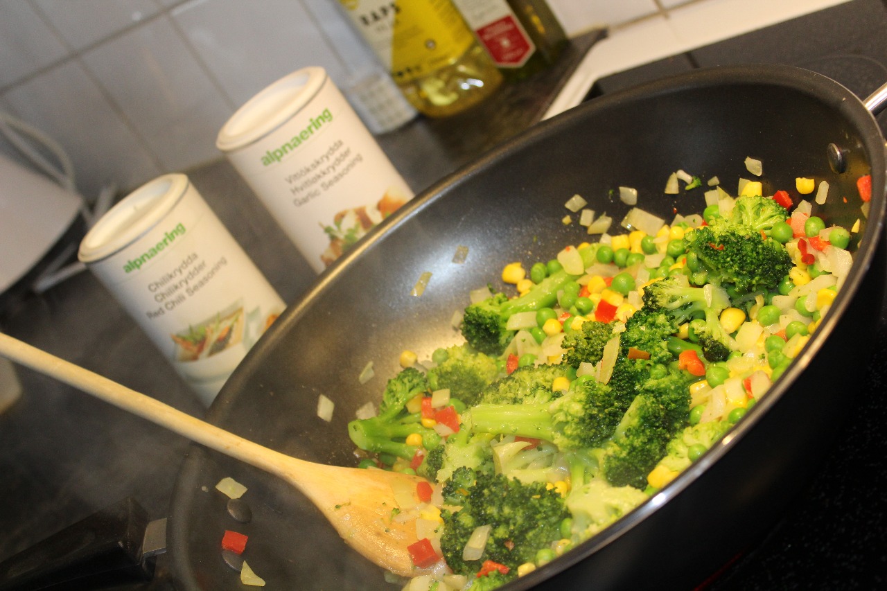 6. Smält en klick smör i en stekpanna och lägg först i den hackade löken. Låt fräsa lite och lägg därefter i ärt/majs/paprika blandningen. Låt fräsa ytterligare några minuter. Krydda med Vilökskrydda/Chilikrydda och ställ åt sidan.