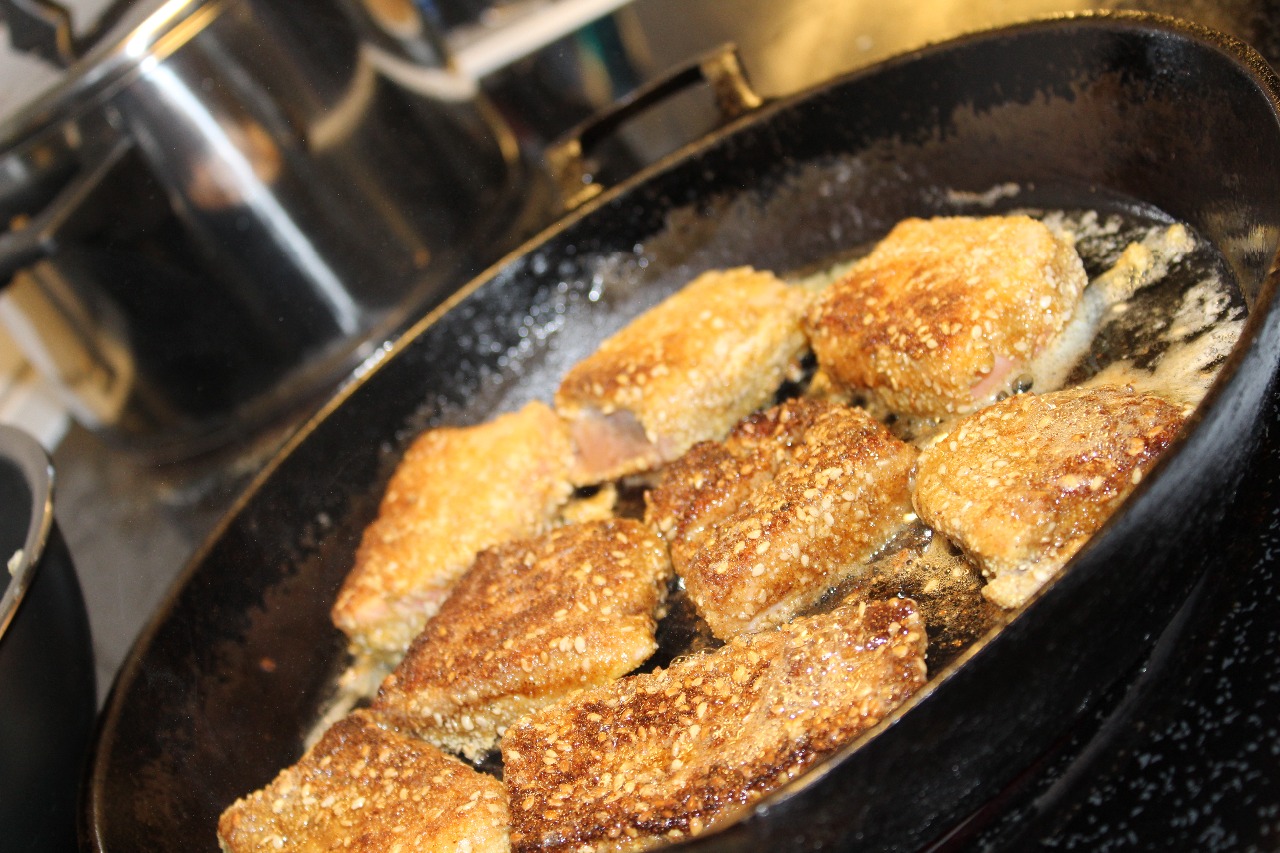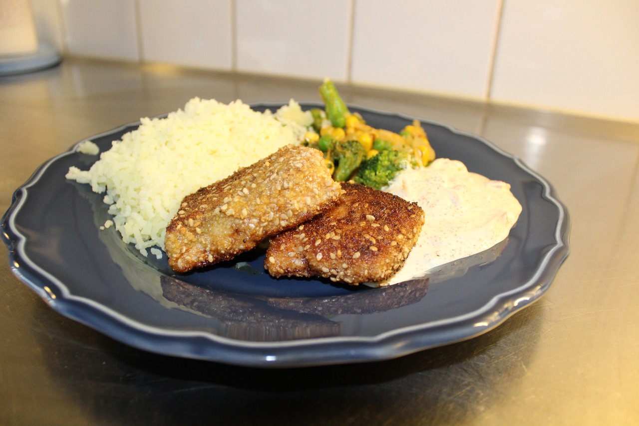 4 msk ströbröd + 2 msk sesamfrön + salt + vitpeppar (alt. 4 msk Alpnaering Paneringsmix + 2 msk sesamfrön)